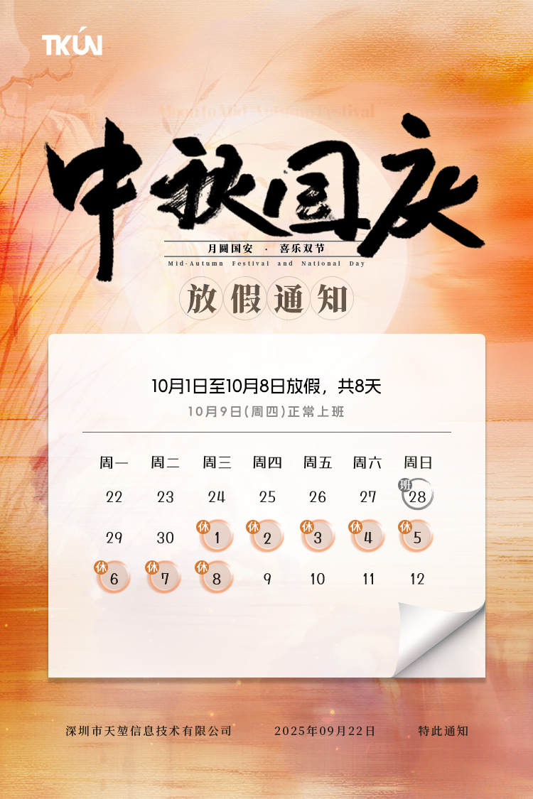 深圳市天堃信息技术有限公司全体同仁: 根据国务院办公厅通知精神,结合我单位实际情况,现将2025年中秋节、国庆节放假安排通知如下: